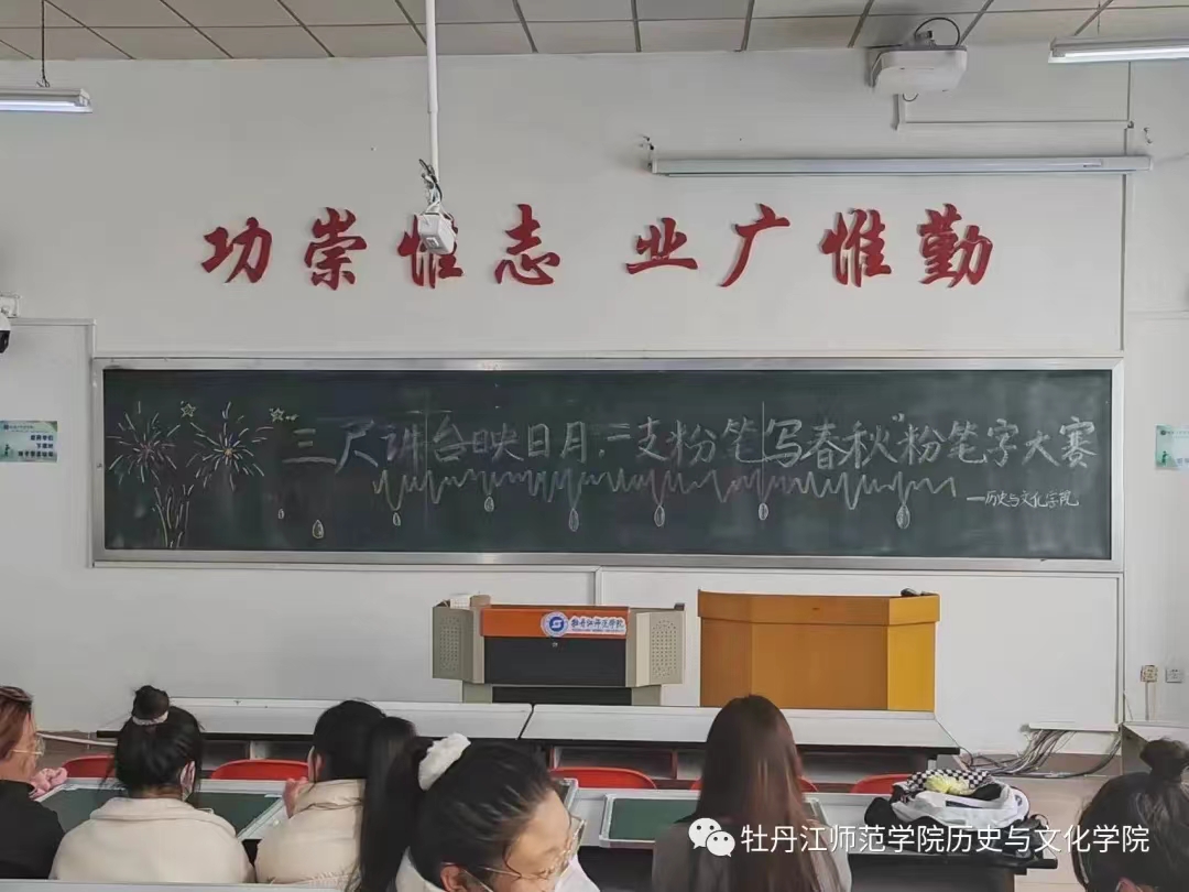 为提高师范学生的教学素养、扎实基本功、营造浓郁的学风,历史与文化学院于3月15日下午13时在文科楼404室举办“三尺讲台映日月,一支粉笔写春秋”粉笔字大赛。历史与文化学院院长卢伟、党委副书记林雅峥、副院长杜品、教授郑云波、教师金枚、单雪超担任评委。本次大赛由21级历史一班学习委员康汭主持,全体师范生参赛。