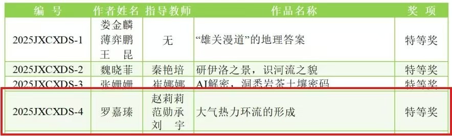 近日,由九州杯地理教学创新大赛组委会主办、陕西师范大学出版总社中学地理教学参考编辑部承办的“2025九州杯地理教学创新大赛”评审结果揭晓。经过激烈角逐,我院23级地理科学专业2班罗嘉瑧同学,在赵莉莉、范勋承、刘宇三位老师的悉心指导下,其参赛作品《大气热力环流的形成》凭借扎实的地理学科素养和创新的教学设计理念脱颖而出,斩获特等奖。