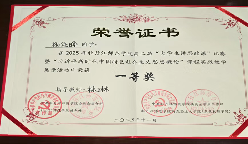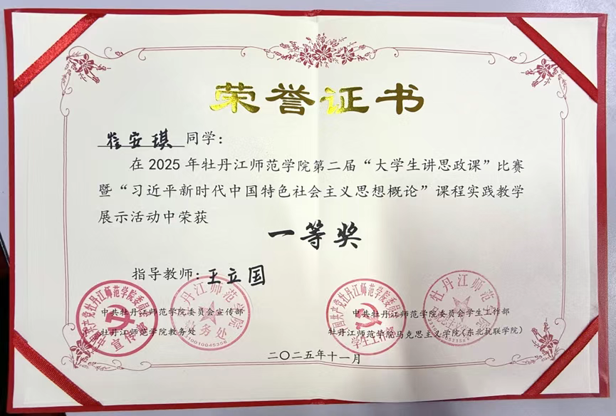 为贯彻习近平总书记“大思政课”建设重要指示,推进思政教育创新、厚植青年家国情怀,牡丹江师范学院举办第二届“大学生讲思政课”比赛暨课程实践展示活动。历史与文化学院2025级历史学崔安琪、杨佳晔同学以深刻理论阐释和鲜活表达,荣获一等奖。