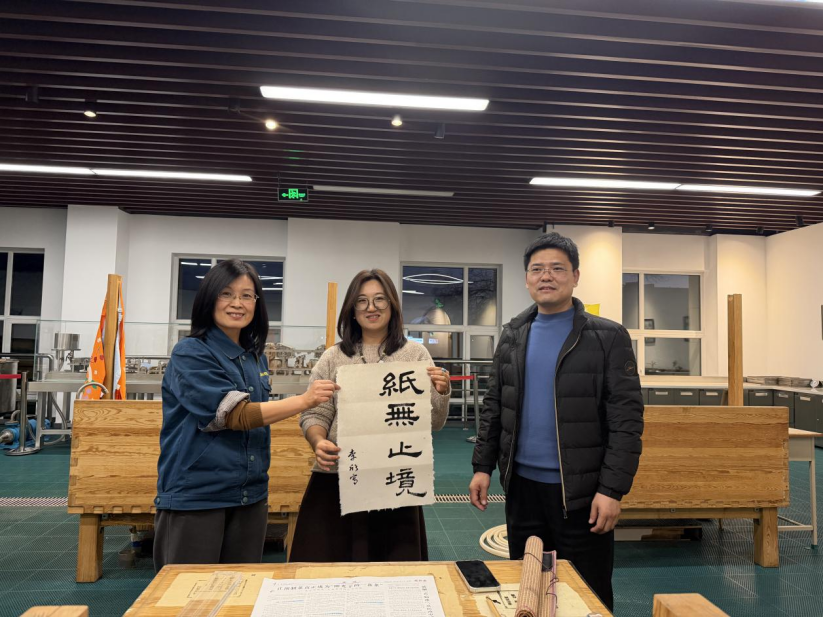 研学过程中还特别安排了互动体验环节,在专业人员的指导下,同学们亲自动手体验传统抄纸工艺,将纸浆均匀地荡入竹帘,滤水、起帘、压平,一张张带着独特纹理的手工纸在手中诞生。