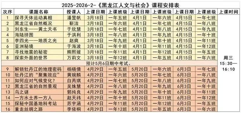黑龙江省作为我国东北边疆的重要省份,拥有丰富的历史文化、自然资源和独特的社会发展脉络。为引导青少年深入了解家乡文化、增强社会责任感,我校与初中合作开发了具有地方特色的《黑龙江人文与社会》课堂,并将其纳入初中课后服务公益课程体系。
