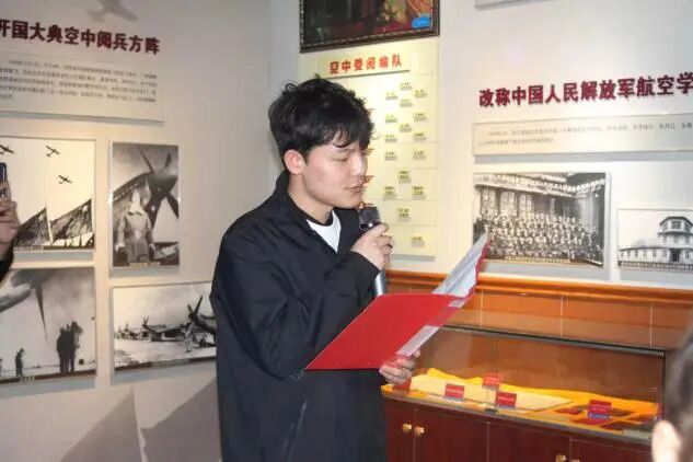 步入第三展区,大家跟随讲解员聆听航空人才培养的艰辛历程与英雄先烈的感人故事,学生代表韩久斯从自身角度出发,讲述老航校学员在艰苦环境中攻坚克难,培育中国首批空军飞行员的峥嵘往事,让每一位听者深受震撼与鼓舞。
