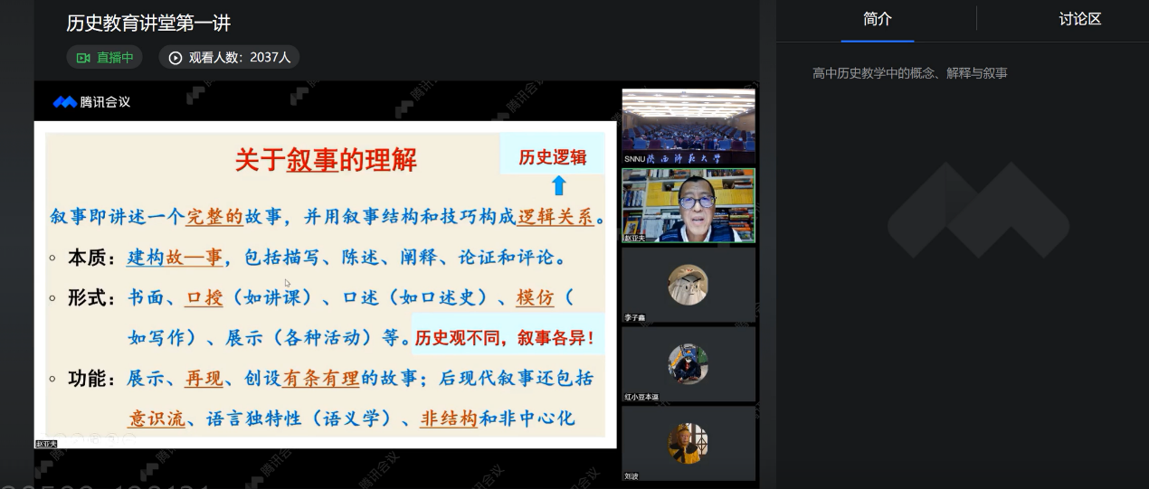 赵亚夫讲授第二方面,对于叙事的理解。叙事就是讲述一个完整的故事,并用叙事的结构和技巧构成逻辑关系。其本质:建构故事,对于过去被记载下来的对今天有意义的事情。在形式上有书面、口授、模仿等。功能方面分为功能、再现以及创设有条有理的故事,其目标就是让学生学会叙事,人人都可以记述历史。