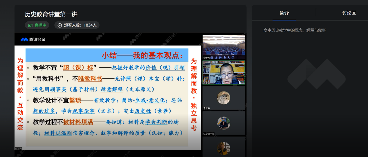 在最后赵亚夫教授针对于本次讲授,进行了总结提出:一是教学不宜“超课标”要把握号教学价值。二是教学设计不宜繁琐,要有效教学。三是教学过程不被材料填满,教材只是判断的途径,过多教材会伤害概念、叙事和解释的质量。四是要突破狭义的历史学教学模式。