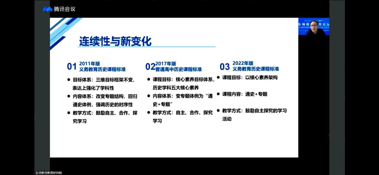 首先,张卓鸿教授提出“要在变与不变的的分析之中去研究新课标的特征与内涵”,分别从目标体系、内容体系、教学方式三个方面论述了从《义务教育历史课程标准(2011年版)》到《普通高中历史课程标准(2017年版)》再到《义务教育课程标准(2022年版)》的延续性发展,重点分析了两版义务教育课程标准在体量和内容上的新变,总结出新版历史课程标准的连续性和新变化的三方面内容:坚持贯彻党的教育方针,如立德树人、素质教育、全面发展、培养合格的社会主义建设者和接班人;以学生全面发展为本的教育思想一脉相承,不断深入,从三维目标发展至核心素养;强调学科属性或学科课程自身的特征。
