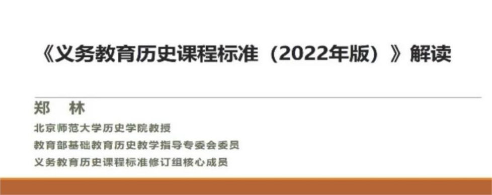 首先,北京师范大学历史学院郑林教授解读的《义务教育历史课程标准(2022年版)》,分为三个部分:义务教育历史课程标准修订背景、《义务教育历史课程标准(2022年版)》的变化与突破、历史教师面临的挑战与应对。