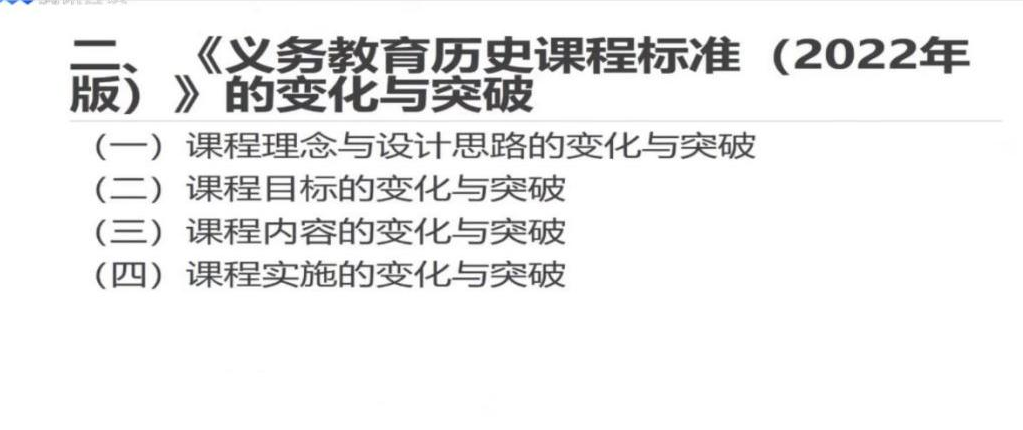 郑教授指出《义务教育历史课程标准(2022年版)》的变化与突破,即课程理念与设计思路的变化与突破、课程目标的变化与突破、课程内容的变化与突破、课程实施的变化与突破等四个方面。在课程理念与设计思路的变化与突破方面,第一,课程目标注重培育学生的核心素养。第二,课程内容的组织结构突出历史发展的阶段性特征,增强内容的综合性。第三,课程内容的选择坚持正确的思想导向和价值引领,注重基础性、生动性。第四,教学方式强调以学生为主体,注重学生的自主探究。第五,课程评价以考查学生的核心素养发展成就为目标,注重评价促进学习和改进教学的功能;在课程目标的变化与突破方面指出采用新的目标分类;在课程内容的变化与突破方面指出,增加了对课程内容的总体说明,新增跨学科主题学习板块,新增学业要求和教学提示,凸显历史发展的线索和阶段特征;在课程实施的变化与突破方面,指出要围绕发展学生的核心素养提出教学建议,强化过程性评价,增设学业水平考试命题要求,新增教学研究与教师培训内容。