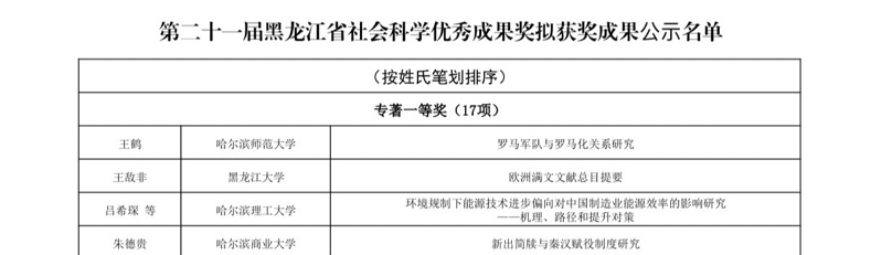 近日,经省功勋荣誉表彰工作领导小组批准,备受瞩目的第二十一届黑龙江省社会科学优秀成果评奖结果正式揭晓。本次评奖严格遵循《黑龙江省社会科学优秀成果评奖办法》等相关规定,最终从众多参评成果中评选出拟获奖成果662项。